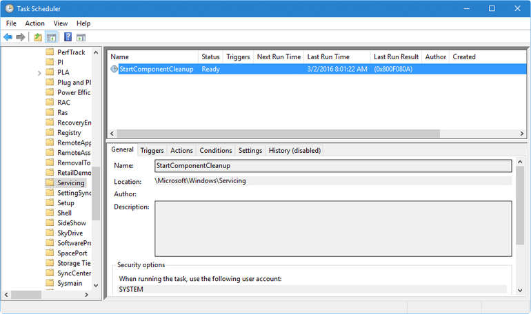 К сожалению, несмотря на то, что задача StartComponentCleanup выполняется на регулярной основе, вы действительно не можете много узнать о том, как и почему она работает, или даже когда она будет работать дальше. Как вы можете видеть, столбец «Триггеры» пуст, как и столбец «Следующее время выполнения». Вы также заметите, что опция History отключена. Все, что вы можете видеть наверняка, — это дата и время в столбце «Последняя продолжительность».
